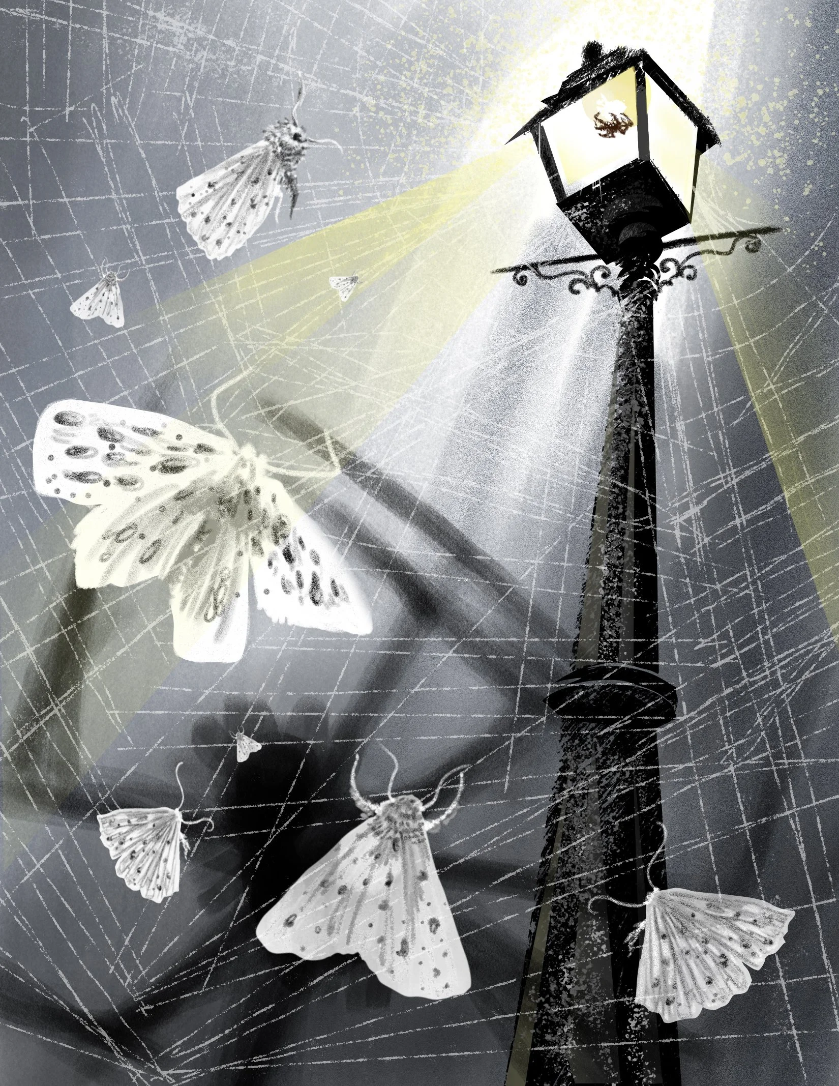 Spot and Full spread Illustrations based off an short story about Urban Ecosystems in Leiden, a city in the Netherlands. From Peregrine falcons, ermine moths, and grove snails- many insects and animals have come to adapt to weather and the infrastructure in the city just like humans.